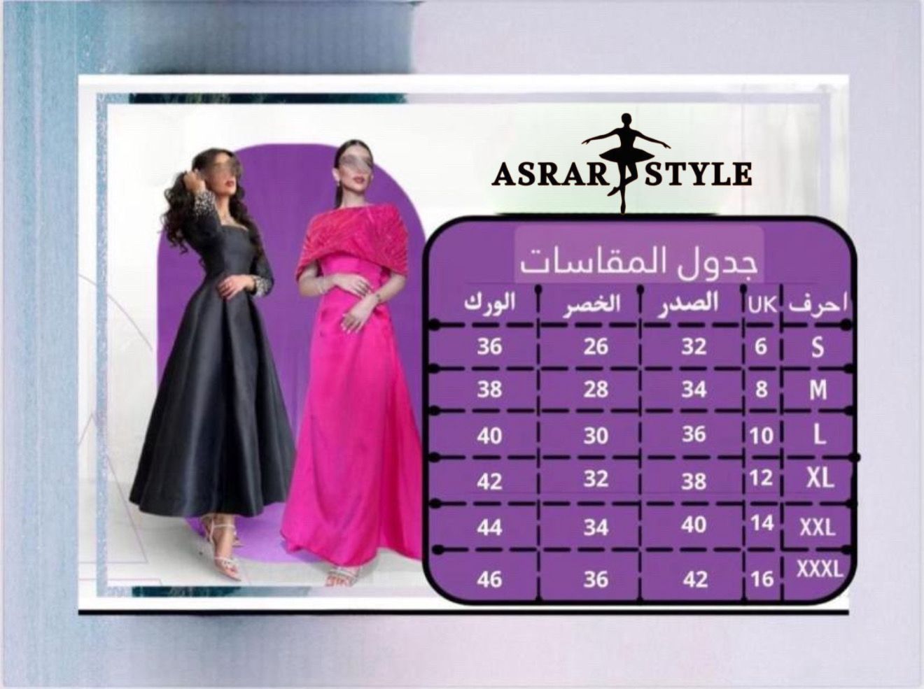 لضمان اختيار المقاس المناسب ، نرفق لكِ جدول المقاسات تنبيه مهم : المقاسات مدونة بوحدة الإنش